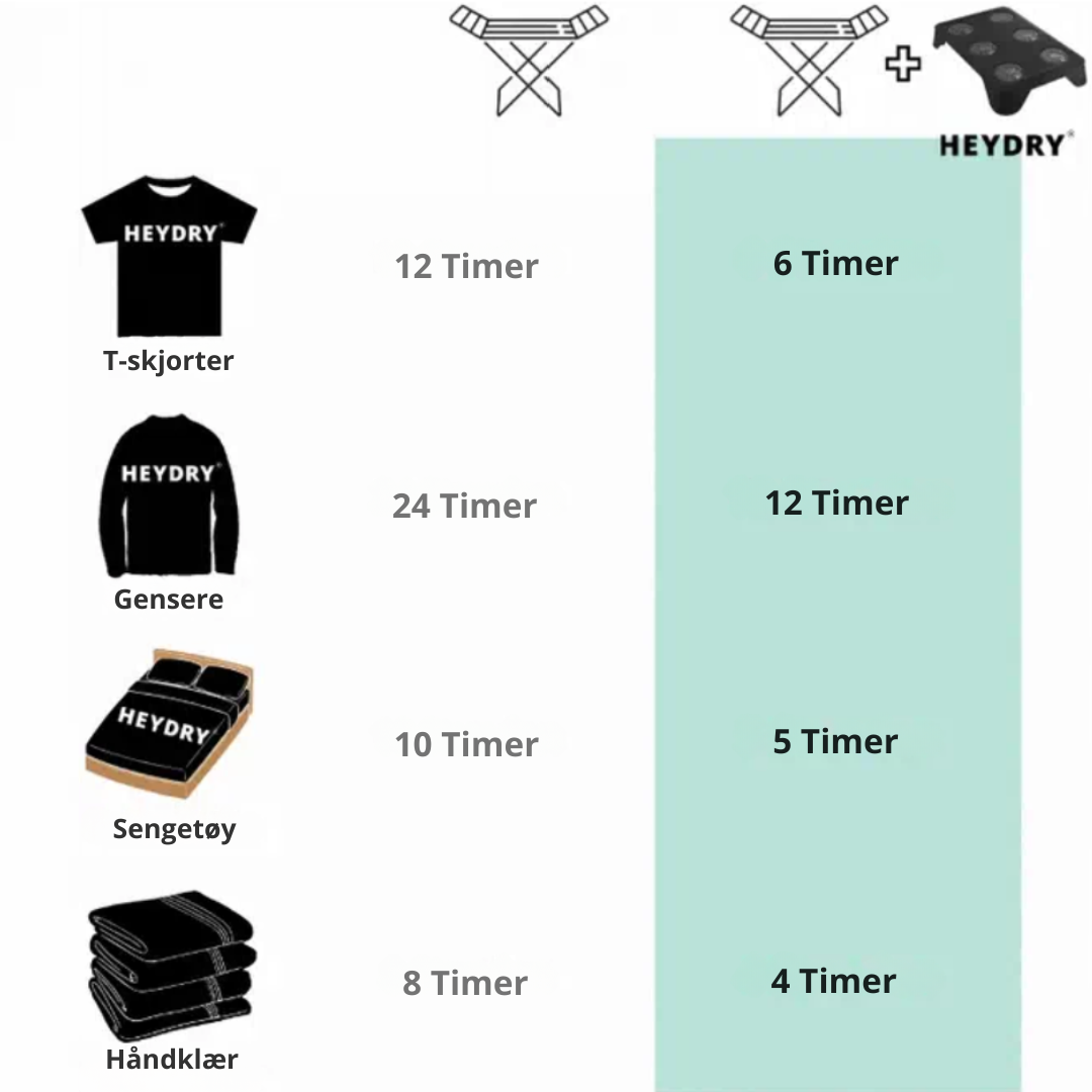 Opplev merkbart kortere tørketider – med HEYDRY tørker tøyet dobbelt så raskt som ved vanlig lufttørking.