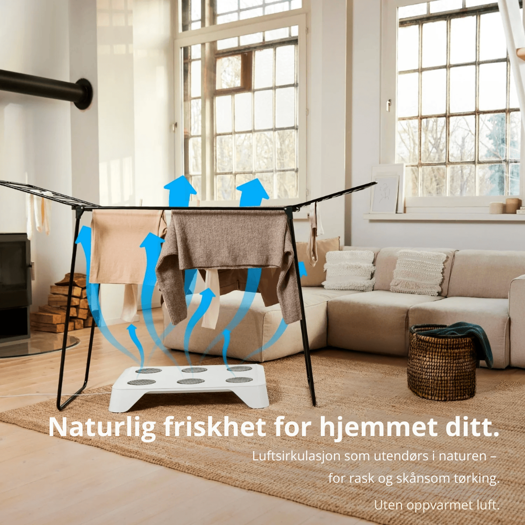 Takket være målrettet luftstrøm og lavt energiforbruk får du effektiv tørk uten varme, slitasje eller lang ventetid. Perfekt for store og små hjem, travle hverdager og alle som vil ta vare på klærne sine – raskt, trygt og smart.